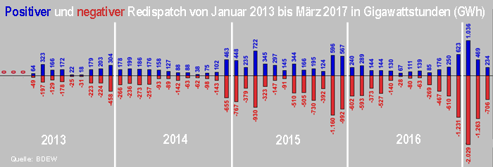 In der Tat laßt sich auch der BDEW-Auswertung entnehmen, daß das Volumen der Redispatch-Maßnahmen 2016 gegenüber dem Vorjahr um rund ein Drittel zurückgegangen ist: Von 11.110 auf 7.381 GWh. Schon im Dezember 2016 zeichnete sich aber ein Wiederanstieg ab, der sich im Januar zu einem Rekord-Volumen von 3.065 GWh auswuchs und auch in den beiden folgenden Monaten höher als im Vorjahr war (siehe Grafik).