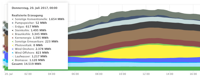 "Smard" ermöglicht aufschlußreiche Einblicke in Stromerzeugung, Verbrauch, am Netz befindliche Erzeugungsleistung, Prognosen, Großhandelspreise oder das Verhältnis zwischen Exporten und Importen. Die obenstehende Grafik veranschaulicht, wie sich die Stromerzeugung am 20. Juli im Stundentakt entwickelte und welche Anteile die einzelnen Stromquellen hatten. Man sieht zum Beispiel, daß die Solaranlagen (gelb) nachts überhaupt keinen Beitrag geleistet haben, tagsüber aber zu Hochform aufliefen und alle anderen Stromquellen an Einspeisung übertrafen. Die auf die einzelnen Erzeugungsarten entfallenden Strommengen kann man sich wahlweise auch viertelstündlich oder über einen längeren Zeitraum anzeigen lassen. |