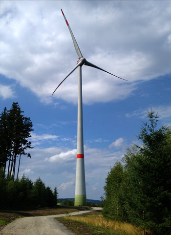 Typisch für neue Windkraftanlagen ist diese getriebelose Enercon mit einer Nennleistung von 3 MW, die Anfang 2017 ans Netz ging: Mit einer Nabenhöhe von 135 Meter und einem Rotordurchmesser von 115 Meter erreicht sie eine Gesamthöhe von 192 Meter. Damit überragt sie deutlich die 162 Meter des Ulmer Münsters, das als höchster Kirchturm der Welt gilt. In Bayern hätte sie deshalb einen Mindestabstand von 1,92 Kilometer zu Wohngebieten einzuhalten. |