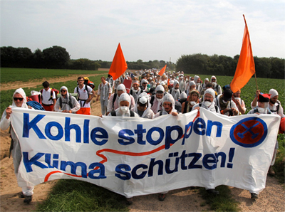 Wie schon vor zwei Jahren (150803) protestierte das Bündnis "Ende Gelände" vom 24. bis 29. August mit drei Klimacamps und zahlreichen Aktionen im rheinischen Revier gegen die weitere Verstromung der klimaschädlichen Braunkohle durch RWE-Kraftwerke. Am 25. und 26. August blockierten tausende Aktivisten die Gleise, über die das Kraftwerk Neurath mit Braunkohle versorgt wird, und forderten den sofortigen Ausstieg aus der Braunkohle. Am Freitag wurde die Kohlebahn über neun Stunden besetzt. Am Samstag dauerten die Blockaden sechs Stunden. RWE mußte deshalb die Leistung von vier Kraftwerksblöcken zeitweilig drosseln. Außerdem gelang es einer Gruppe von Aktivisten trotz polizeilicher Absperrungen, in den Tagebau Garzweiler einzudringen. Die Polizei nahm Hunderte von Demonstranten vorübergehend fest. Für den 4./5. November – zu Beginn der UN-Klimaverhandlungen in Bonn – hat das Bündnis Ende Gelände zu weiteren "Massenaktionen zivilen Ungehorsams" aufgerufen.