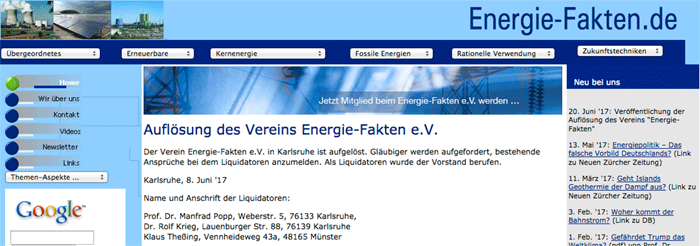 Im August ließen sich die Energie-Fakten noch wie gewohnt aufrufen. Allerdings scheiterte der Versuch einer Kontaktaufnahme mit dem Vereinsvorsitzenden Manfred Popp daran, daß die für Anfragen angegebene E-Post-Adresse nicht mehr funktionierte. Lediglich der Webmaster und Kassenwart des Vereins, Klaus Theißing, war noch erreichbar. Dieser bestätigte die Vermutung, daß es sich wegen des geringen Spendenaufkommens nicht mehr rentiert habe, den Förderverein beizubehalten.