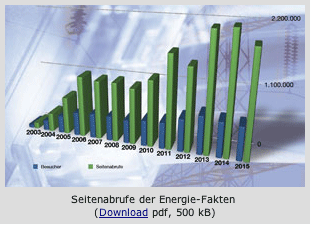 Wegen der eher langweiligen und wenig informativen Machart, die mehr Bräsigkeit als Seriösität ausstrahlte, dürfte sich die Attraktivität der Energie-Fakten für Nutzer wie für Werbekunden in engen Grenzen gehalten haben. In den Anfängen mußte man die Seitenabrufe wohl mit der Lupe suchen, denn sie wurden erst gar nicht ausgewiesen (siehe Grafik). Bis 2010 stiegen sie dann auf bis zu 1,1 Millionen jährlich. Nach der Vereinsgründung unter dem Vorsitz von Popp wurden es zeitweilig über zwei Millionen. Damit seien die Energie-Fakten "eine der größten unabhängigen Informationsplattformen im deutschsprachigen Internet zu Energiefragen", hieß es vollmundig. Webmaster Theißing glaubt sogar, daß es sich um die "meistbesuchte unabhängige Seite Deutschlands" gehandelt habe. Indessen sind zwei Millionen Seitenabrufe pro Jahr für ein Internet-Portal überhaupt nicht viel: Schon eine rein private Webseite wie die vorliegende, zu der die ENERGIE-CHRONIK gehört, hat in den vergangenen zwölf Monaten nachweislich 3,65 Millionen Seitenabrufe gehabt – und das mit minimalem Aufwand, ohne Sponsoren und völlig frei von Werbung.
