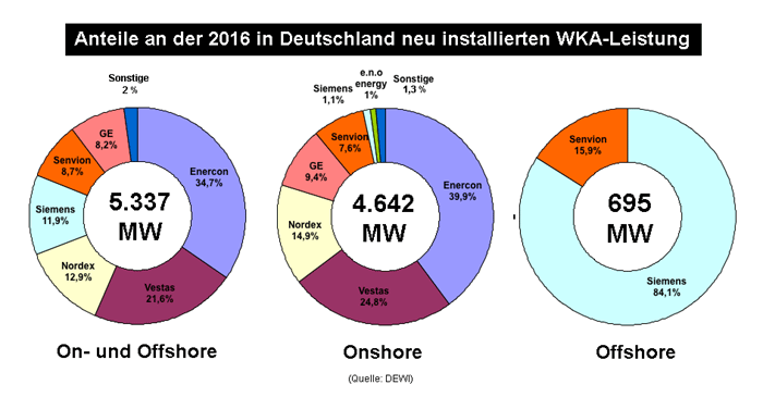 Hauptursache war Indien, wo der Markt infolge der Umstellung des Vergabeverfahrens auf Auktionen zusammengebrochen ist. Entsprechend schrumpften die Aufträge im bislang wichtigsten Wirtschaftsraum Asien um 87 Prozent. Aber auch im Wirtschaftsraum Europa-Arabien-Afrika wurden fast 15 Prozent weniger landgestützte Windkraftanlagen verkauft, und auf dem amerikanischen Kontinent waren es sogar 53 Prozent weniger.