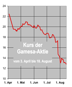 Der neue Weltmarktführer bei Windkraftanlagen, der aus der Zusammenlegung der Siemens Wind Power mit dem spanischen Hersteller Gamesa entstand (160601), hat dem Siemens-Konzern bisher ein enttäuschendes Ergebnis beschert: In den den vier Monaten seit dem Neustart ist der Kurs der Aktie fast um die Hälfte eingebrochen. Der Grund dafür ist ein weltweiter Auftragsrückgang.