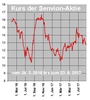 Entgegen den Erwartungen der beiden Investoren schaffte die in Luxemburg registrierte Senvion S.A. den erneuten Gang an die Börse erst im zweiten Anlauf (160320). Im August 2016 beschloß der Vorstand ein Aktienrückkaufprogramm mit einer maximalen Höhe von 75 Millionen Euro. Bis 18. August 2017 wurden 1.094.965 der insgesamt 65 Millionen Aktien für 14.738.090 Euro zurückgekauft, was den seit Börsenstart sinkenden Kurs aber nur bedingt aufzuhalten vermochte (siehe Grafik).