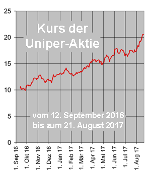 An der Börse hat sich die Aktie von Uniper erstaunlich gut gemacht, nachdem sie für den Mutterkonzern E.ON zunächst eher ein bescheidener Erfolg war (161003) und beim Vergleich mit dem fulminanten Start der RWE-Tochter Innogy (161002) sogar wie ein Aschenputtel aussah. Schon Ende 2016 zeigte sich, daß das konventionelle Kraftwerksgeschäft doch nicht so unergiebig ist (161111). Inzwischen hat sich Wert der Aktie seit Börsenstart verdoppelt (siehe Grafik). Damit zahlt sich aus, daß E.ON von dem ursprünglichen Plan wieder abgerückt ist, der neuen Tochter auch die Kernkraftwerke mitsamt allen Lasten aufs Auge zu drücken und so aus ihr eine Art "Bad Bank" zu machen (141203, 150403, 150901). Am 8. August berichtete Uniper über einen Konzernüberschuß von voraussichtlich 1,1 Milliarden Euro im Geschäftsjahr 2017 und erhöhte den Gesamtbetrag der angestrebten Dividende von 230 auf 250 Millionen Euro.