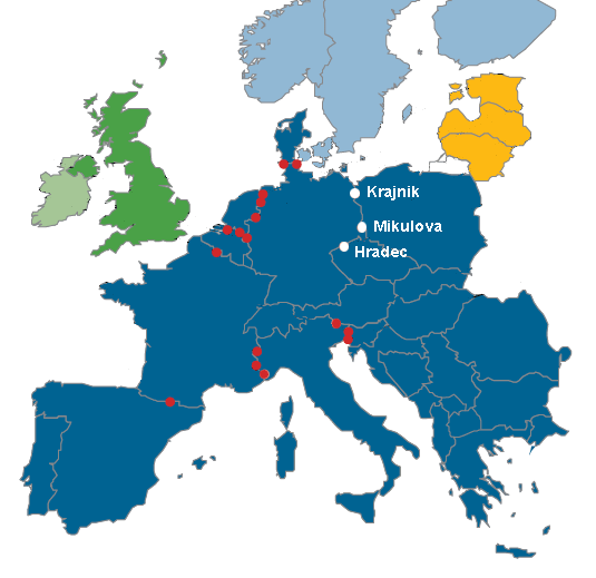 An anderen Landesgrenzen innerhalb des kontinentaleuropäischen Verbundsystems (blau) gibt es schon seit längerem Phasenschieber, mit denen unerwünschte Stromflüsse abgeblockt werden können (rot). Nun werden solche Anlagen auch an den Verbindungen des deutschen Netzes mit Tschechien (Hradec) und Polen (Krajnik, Mikulova) errichtet. Als Folge drückt noch mehr Strom auf die innerdeutschen Netzengpässe. Quelle: ENTSO-E