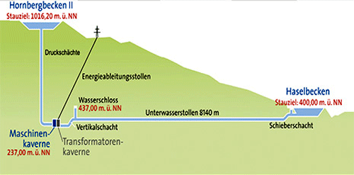 Eine technische Besonderheit des Projekts bestand darin, daß das Maschinenhaus nicht am Unterbecken, sondern tief unter der Erde in einer Kaverne errichtet werden sollte. Die Kaverne hätte sich etwa 700 Meter direkt unterhalb des Oberbeckens befunden, so daß die Pumpturbinen über einen senkrechten Schacht mit den herabstürzenden Wassermassen aus dem Oberbecken beschickt worden wären (siehe Grafik).
