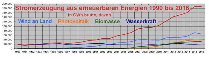 | Bis in die zweite Hälfte der neunziger Jahre war die Stromproduktion aus erneuerbaren Energien fast identisch mit dem Beitrag der Wasserkraft. Dieser blieb bis heute etwa auf demselben Niveau (dunkelblau), wurde aber ab 2003 durch die Windkraft (hellblau) übertroffen. Seit 2011 behaupten Photovoltaik (orange) und Biomasse (grün) den zweiten bzw. dritten Platz in der Rangfolge. Die übrigen erneuerbaren Stromquellen (z.B. Windenergie auf See, Geothermie oder Deponiegase) sind in dieser Grafik aus Darstellungsgründen nicht gesondert aufgeführt. Zusammen hatten sie 2016 einen Anteil von rund 17 Prozent an der Gesamterzeugung. |