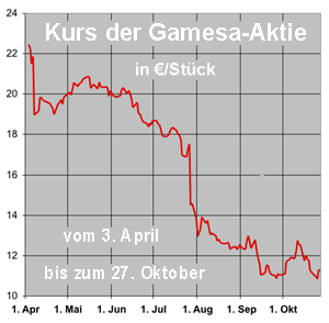 An der Madrider Börse sank der Kurs der Gamesa-Aktie seit der Fusion schier unaufhaltsam. Am 25. Oktober erreichte er mit 10,83 Euro den bisher tiefsten Stand. |