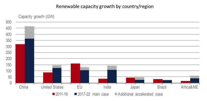 "Wir sind Zeuge der Geburt einer neuen Ära für die Photovoltaik", resümierte IEA-Direktor Fatih Birol. "Wir erwarten, daß die Photovoltaik-Kapazitäten bis 2022 schneller wachsen als die aller anderen Erneuerbaren-Technologien." Insgesamt sei bis dahin mit einem Zuwachs der Erneuerbaren-Kapazitäten um etwa 1000 Gigawatt zu rechnen. Das entspräche etwa der Hälfte der derzeit weltweit installierten Kapazitäten zur Kohleverstromung, die in 80 Jahren aufgebaut worden seien. Der Beitrag der Erneuerbaren zur Stromerzeugung werde sich damit um mehr als ein Drittel auf über 8.000 Terawattstunden erhöhen, was dem Verbrauch von China, Indien und Deutschland zusammengenommen entspreche.