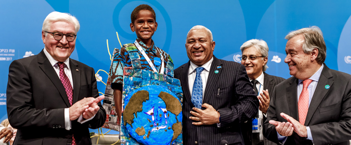 Zu Beginn der Konferenz berichtete der zwölfjährige Fidschi-Junge Timoci Naulusala von der Zerstörung seines Dorfes durch einen Wirbelsturm und forderte die Politiker zum Kampf gegen den Klimawandel auf. Links Bundespräsident Frank-Walter Steinmeier, rechts Fidschi-Ministerpräsident Frank Bainimarama und UN-Generalsekretär Antonio Guterres. Foto: BMUB/Michael Gottschalk