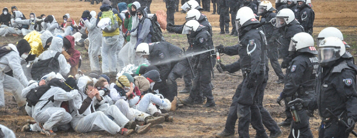 Die Polizei habe zunächst zurückhaltend reagiert, hieß es in einer Pressemitteilung des Aktionsbündnisses. Auf dem Weg in den Tagebau sei es noch zu keiner Konfrontation gekommen. Unten in der Grube sei die Polizei dann aber mit einer Reiterstaffel in die Aktivisten hineingeritten und habe sitzende Demonstranten mit Pfefferspray angegriffen (siehe Foto). Der Bundestagsabgeordnete Lorenz Gösta Beutin (Linke) bekundete als Beobachter des Geschehens ebenfalls, daß die Polizei und insbesondere die Reiterstaffel unverhältnismäßige Gewalt angewendet habe.