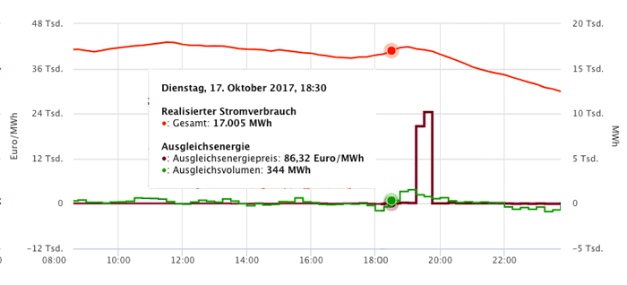 Mit dem neuen Informationssystem "Smard" (170701) läßt sich genau verfolgen, wie der Bedarf an Ausgleichsenergie am Abend des 17. Oktober plötzlich ungewöhnlich hoch wurde und wie in der Folge der Preis pro Megawattstunde geradezu explodierte. |