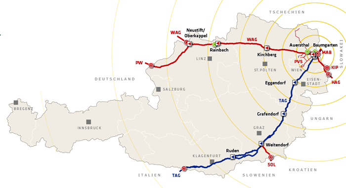 In Baumgarten wird russisches Erdgas an und über die Nachbarländer weitergeleitet sowie ins österreichische Verteilnetz eingespeist. In Richtung Deutschland erfolgt die Weiterleitung über die West-Austria-Gasleitung (WAG) mit dem Abzweig Penta-West (PW) nach Süddeutschland. Die Versorgung Italiens, Kroatiens und Sloweniens sichert die Trans-Austria-Gasleitung (TAG) mit der von ihr abzweigenden Süd-Ost-Gasleitung (SOL). Über die östlich gelegene Hungaria- Austria-Gasleitung (HAG) wird das Nachbarland Ungarn beliefert. Die March-Baumgarten- Gasleitung (MAB) verbindet den slowakischen Erdgasspeicher LAB mit Baumgarten. Die Kittsee-Petrzalka-Gasleitung (KIP) verläuft von Berg/Kittsee bis zur slowakischen Grenze. WAG und Penta-West wurden inzwischen "reverseflow"-fähig gemacht. Sie können also auch in der umgekehrten Richtung Erdgas transportieren, um beispielsweise über Baumgarten die Ukraine zu versorgen (140402). Karte: Gas Connect Austria |