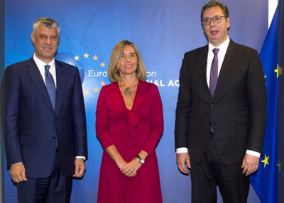 Durch Vermittlung der EU-Außenbeauftragten Federica Mogherini kam im August 2015 eine Vereinbarung über die baldige Aufnahme des Kosovo in die ENTSO-E zustande, die dann aber von Serbien torpediert wurde. Das Foto zeigt Mogherini bei einem weiteren Treffen mit dem Kosovo-Präsidenten Hashim Taci (links) und dem serbischen Präsidenten Aleksandar Vucic (rechts), das im Juli vergangenen Jahres stattfand. Foto: EU