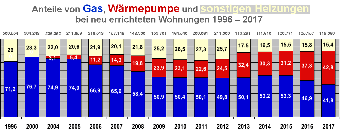 | Noch 2015 erreichte der Anteil der Wärmepumpe bei der Beheizung neuer Wohngebäuden erst 31 Prozent. In den vergangenen beiden Jahren hat er aber deutlich zugelegt und mit 43 Prozent sogar die Gasheizung vom ersten Platz verdrängt. - Über den Jahresbalken ist die Anzahl der jeweils erfaßten Neubauwohnungen vermerkt, auf die sich die Prozentangaben beziehen. (ZURÜCK) |