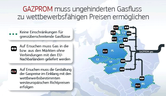 Die EU-Kommission verdächtigte Gazprom, eine umfassende Strategie zur Abschottung der Gasmärkte in acht Mitgliedstaaten zu verfolgen (Bulgarien, Estland, Lettland, Litauen, Polen, Slowakei, Tschechische Republik und Ungarn) sowie fünf dieser Länder überhöhte Gaspreise in Rechnung zu stellen. Mit den jetzt erwirkten Zusagen sieht sie diese Bedenken ausgeräumt. Die Gazprom-Kunden in Mittel- und Osteuropa bekämen damit ein wirksames Instrument an die Hand, mit dem sie sicherstellen können, dass sie Wettbewerbspreise zahlen, erklärte die für Wettbewerbspolitik zuständige EU-Kommissarin Margrethe Vestager. "Die Sache ist damit aber noch nicht erledigt – heute beginnt lediglich die Durchsetzung der Gazprom auferlegten Verpflichtungen."