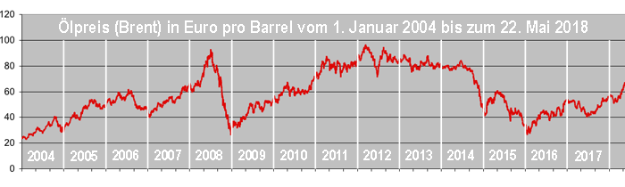 Mit über 67 Euro pro Barrrel Brent-Rohöl erreichte der Ölpreis Ende Mai einen seit November 2014 nicht mehr erreichten Höchststand. Aktueller Anlass war die Aufkündigung des 2015 mit dem Iran geschlossenen Atomabkommens (150707), die US-Präsident Trump am 7. Mai erst per "Twitter" und tags darauf offiziell verkündete.