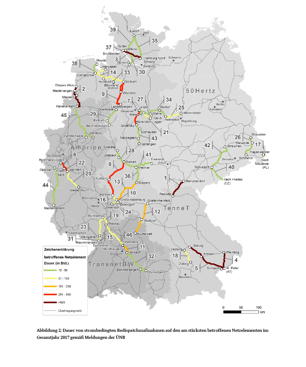 Die am stärksten von Redispatch-Maßnahmen betroffenen Abschnitte des deutschen Netzes