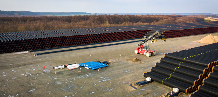 Bei Mukran auf Rügen lagern schon seit 2017 rund 45.000 Rohre für die beiden neuen Stränge der Ostsee-Pipeline, die von hier aus verlegt werden sollen. Weitere solcher Rohrlager gibt es in den finnischen Häfen Hanko und Kotka sowie im schwedischen Hafen Karlshamn. Vor der Verlegung werden die Rohre mit Beton ummantelt, damit sie im Wasser nicht auftreiben.