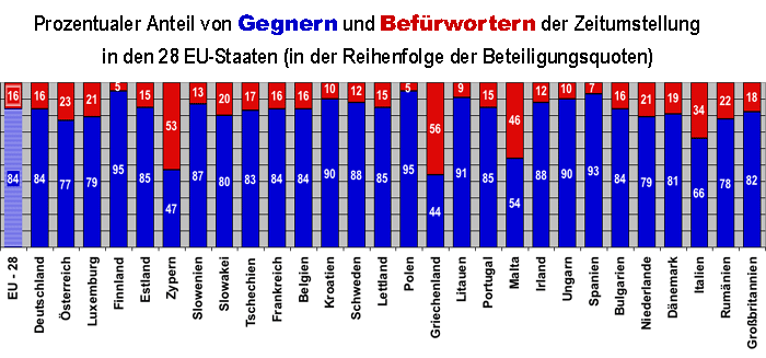 Die 84 Prozent der Teilnehmer, die in Deutschland gegen die Zeitumstellung votierten, entsprachen genau dem EU-Durchschnitt, der natürlich von der stark überproportionalen Beteiligung im bevölkerungsreichsten Mitgliedsland maßgeblich geprägt wurde. Eine frühere Meinungsumfrage hatte eine Mehrheit von 73 Prozent gegen die Zeitumstellung ergeben. Daraus läßt sich ungefähr abschätzen, wie sehr das Ergebnis der Umfrage dadurch beeinflußt wurde, dass sich mehr Gegner als Anhänger der Zeitumstellung beteiligt haben.