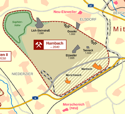 Fragwürdig geworden sind auch die ursprünglich geplanten Nutzungsdauern der Tagebaue, die für Hambach bis 2040, für Garzweiler II bis 2045 und für Inden bis 2030 reichen sollten. Schon vor vier Jahren befand die damalige Landesregierung, dass Garzweiler II voraussichtlich nur bis 2030 benötigt werde, weshalb zwei Orte von der Abbaggerung verschont bleiben könnten (140315).