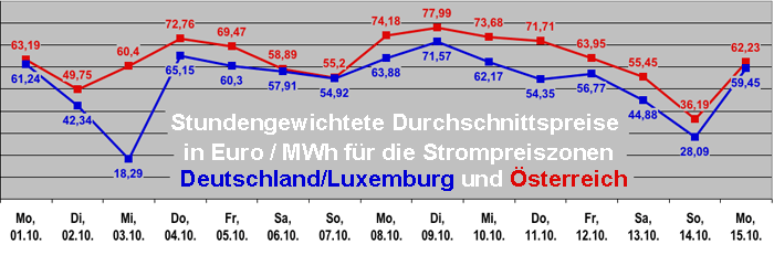 | Diese Grafik zeigt den den stundengewichteten Durchschnittspreis für Grundlast-Strom im vortägigen Handel an der Epex Spot von Beginn der Umstellung bis Mitte Oktober ("Phelix Base"). Erwartungsgemäß war er für die nun abgetrennte österreichische Handelszone immer höher als für das verbliebene Marktgebiet Deutschland/Luxemburg. Dabei differierte er in den beiden neu geschaffenen Handelszonen um bis zu 42 Euro pro Megawattstunde (3.10.). Die geringste Abweichung betrug 28 Cent (7.10.). Im deutschen Marktgebiet wurden in der ersten Hälfte des Monats insgesamt 8.930.128 Megawattstunden gehandelt. Die österreichische Zone erreichte mit 1.641.273 MWh weniger als ein Fünftel dieses Volumens. |