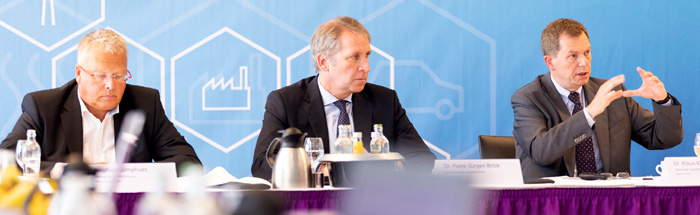 Vorerst sind bei beiden Netzbetreiber-Konsortien die Pläne noch sehr vage. Anscheinend geht es ihnen erst einmal darum, die rechtlich-politischen Voraussetzungen zu klären. Den Anfang machten im Juni der Übertragungsnetzbetreiber Amprion und der Gasfernleitungsbetreiber Open Grid Europe (OGE), indem sie das Projekt einer Strom-zu-Gas-Anlage im Leistungsbereich von 50 bis 100 MW vorstellten. Das Foto zeigt v.r.n.l. den technischen Geschäftsführer von Amprion, Klaus Kleinekorte, den kaufmännischen Geschäftsführer von Amprion, Hans-Jürgen Brick, und den Geschäftsführer der OGE-Muttergesellschaft Vier Gas Transport GmbH, Stephan Kamphues.