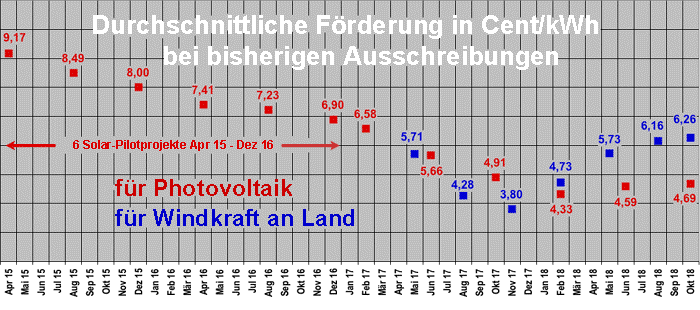 | Schon bei den sechs Pilot-Ausschreibungen für Photovoltaik, die in den Jahren 2015 und 2016 durchgeführt wurden, sank der Förderbedarf dieser Stromquelle kontinuierlich. Bei der zweiten regulären Ausschreibung am 1. Juni 2017 unterschritt er sogar erstmals den Förderbedarf von Windkraft-Projekten. Bei den beiden folgenden Wind-Ausschreibungen am 1. August und 1. November 2017 hatte dann diese Energiequelle wieder die Nase vorn. Das lag allerdings nur an der Ausnutzung der Privilegien für "Bürgerenergiegenossenschaften" durch Unternehmen, für die sie nicht gedacht waren (171112). Nach der Suspendierung dieser Privilegien (170801) gelangte die Photovoltaik bei der nächsten Ausschreibung, die für beide Stromquellen zum 1. Februar 2018 stattfand, wieder an die Spitze der Preisgünstigkeit. In den vergangenen Monaten hat sie diesen Vorsprung weiter ausgebaut, obwohl der Förderbedarf für beide Stromquellen wieder anstieg. Bei den Ausschreibungen, die jetzt für beide zum 1. Oktober stattfanden, hatte Solarstrom einen um 1,57 Cent niedrigeren Förderbedarf als Windstrom. |