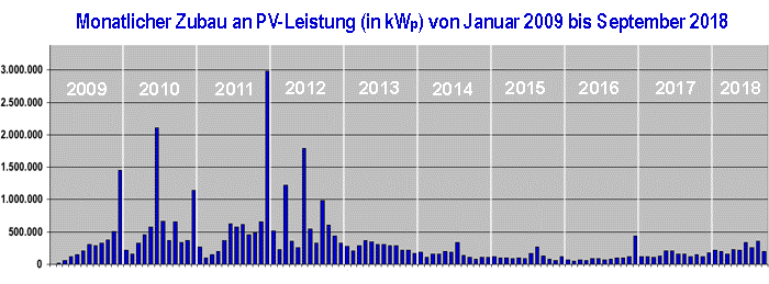 In der Tat ist nach einer jahrelangen Phase der Stagnation, die sich schon 2013 abzuzeichnen begann (130706), neuerdings wieder ein etwas verstärkter Zubau an PV-Leistung zu verzeichnen (siehe Grafik 2). Zum Beispiel betrug der "annualisierte Zubau", der für die quartalsweise Neuberechnung der EEG-Förderung maßgeblich ist, im zweiten Quartal dieses Jahres 3.193.140 kWp, während es im zweiten Quartal 2017 nur 1.965.951 kWp waren. Er lag damit um 693 MWp über den 2.500 MWp, die gemäß § 49Abs. 2 EEG als erwünschter Zubau gelten.