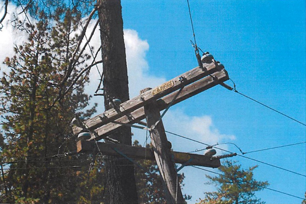 Nicht in der Dritten Welt, sondern in Kalifornien wurde dieser Eckmasten eines Verteilernetzes von der Forstbehörde als Ursache eines Brandes identifiziert. Das Foto trägt den Vermerk: "Close-up of crossarms on burnt-through corner power pole." Foto: Cal Fire / J. Engel