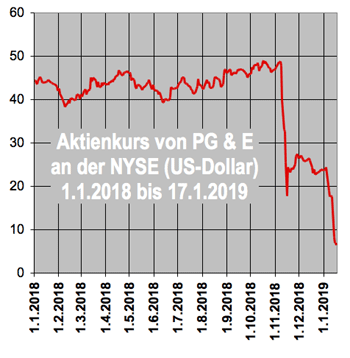 Die Pacific Gas & Electric Corporation (PG & E) hat am 29. Januar den Schutz vor Gläubigern gemäß Abschnitt 11 des US-Insolvenzrechts beantragt. Der Grund sind Schadensersatzforderungen von bis zu 30 Milliarden Dollar, die wegen der Waldbrände in Kalifornien auf sie zukommen. Eine Untersuchung hat ergeben, dass die Stromleitungen des Unternehmens in den Jahren 2014 bis 2017 insgesamt 1.500 Brände ausgelöst haben. Es wird vermutet, dass so auch die jüngste Katastrophe im Oktober 2018 zustande gekommen ist, bei der 14.000 Häuser niederbrannten und 85 Menschen ums Leben kamen.