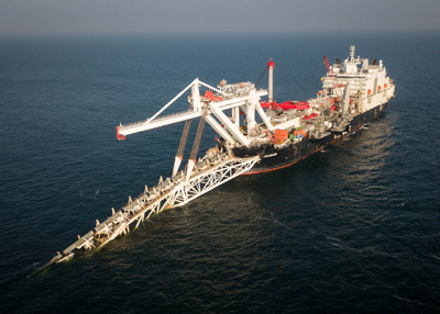 Gazprom begann schon im vorigen Jahr mit der Verlegung der neuen Pipeline, um noch vor einer Verschärfung der EU-Gasrichtlinie vollendete Tatsachen zu schaffen. Auf dem Foto versenkt das Verlegeschiff "Audacia" einen der Stränge über einen langen Ausleger in der Ostsee. Die Röhren werden an Bord des Schiffs zusammengeschweißt. Foto: Nord Stream 2 AG