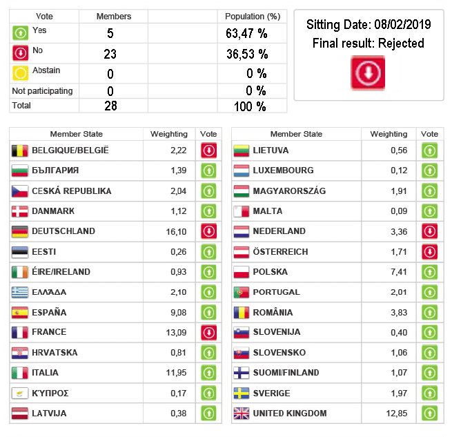 Als sich der Abstimmungstermin im Ministerrat nicht länger umgehen ließ, wollte die Berliner Regierung von dieser Blockademöglichkeit Gebrauch machen, um eine weitere Verzögerung erreichen. Die französische Regierung scherte aber plötzlich aus dem Fünfer-Bündnis aus. Anfang Februar teilte sie der Bundesregierung mit, dass sie bei der Sitzung des Ministerrats am 8. Februar für den Gesetzgebungsvorschlag der Kommission stimmen werde. Mit dem Umschwenken der Pariser Regierung wäre die unveränderte Annahme des Gesetzgebungsvorschlags der Kommission im Ministerrat möglich geworden, da Frankreich 13,09 Prozent der EU-Bevölkerung vertritt.