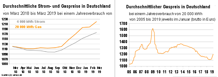 Der durchschnittliche Gaspreis in Deutschland ist zwischen März 2018 und März 2019 sogar um 9 Prozent gestiegen. Der Preis pro Kilowattstunden Erdgas liegt aktuell bei 6,1 Cent. Ein Jahr zuvor waren es noch 5,6 Cent/kWh. Die jährlichen Kosten für einen Haushalt mit einem Verbrauch von 20.000 kWh erhöhten sich nach Angaben von Verivox von 1.120 auf 1.220 Euro. Das entspricht einer zusätzlichen Belastung von 100 Euro pro Jahr. Das Vergleichsportal Check24 errechnete für dieselbe Bezugsmenge Gas sogar einen Durchschnittspreis von 1263 Euro.