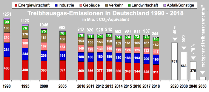 Die deutschen Treibhausgas-Emissionen sind nach vier Jahren zum ersten Mal wieder zurückgegangen. Dies ergibt sich aus den vorläufigen Zahlen für das Jahr 2018, die das Bundesumweltamt am 4. April veröffentlichte. Insgesamt wurden im vergangenen Jahr 866 Millionen Tonnen CO2-Äquivalent freigesetzt. Das sind 41 Millionen Tonnen weniger als im Vorjahr. Bestes Ergebnis waren bisher 903 Millionen Tonnen im Jahr 2014. Dieser Wert wird nun um 37 Millionen Tonnen unterboten. Im Vergleich zu 1990 hat Deutschland damit seine Emissionen um 30,8 Prozent gesenkt. Freilich ist das weiterhin viel zu wenig, um jene Minderung von 40 Prozent bis 2020 zu erreichen, die seit 2013 regierungsamtlich als Zielmarke gegolten hat (180104).