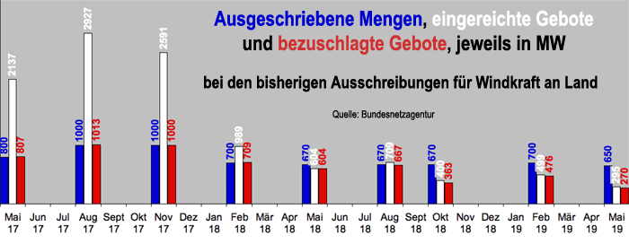 | Die zwei- bis dreifache Überzeichnung der drei ersten Ausschreibungen für Windkraft an Land erwies sich schnell als Strohfeuer, nachdem die Mißbrauchsmöglichkeiten der Privilegien für "Bürgerenergiegesellschaften" beseitigt wurden. Seit der fünften Auktion wurde es sogar zur Regel, dass die Gebote für WKA-Projekte großteils nicht ausreichen, um die zur Vergabe anstehenden Megawatt-Mengen auszuschöpfen. |