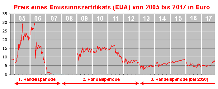 Um eine klimaschützende Wirkung zu haben, hätte ein EUA-Zertifikat mindestens 20 bis 30 Euro kosten müssen. In der ersten Handelsperiode (2005 bis 2007) wurde dieses Preisniveau nur solange erreicht, bis sich herumsprach und von der EU-Kommission bestätigt wurde, das anstelle des vermeintlichen Mangels ein Überschuß an Zertifikaten bestand. Darauf folgte ein schlagartiger Absturz. Zum Schluß bewegten sich die Preise wenige Cent über null , da unverbrauchte Zertifikate noch nicht durch neue Papiere für die folgende Handelsperiode ersetzt wurden. Die in dieser Grafik sichtbare Lücke bis Januar 2009 entstand dadurch, daß wegen der verzögerten Ausgabe für die zweite Handelsperiode kein Spothandel stattfand. Anschließend erreichte der Preis für ein EUA-Zertifikat im März 2011 den Maximalwert von 17,28 Euro, um dann bis auf weniger als die Hälfte abzusinken. In der ab 2013 folgenden dritten Handelsperiode, die bis heute andauert, waren gut acht Euro bis Ende 2017 der Höchstpreis. Meistens kostete ein Zertifikat deutlich weniger, im Extremfall sogar nur 1,9 Euro. |