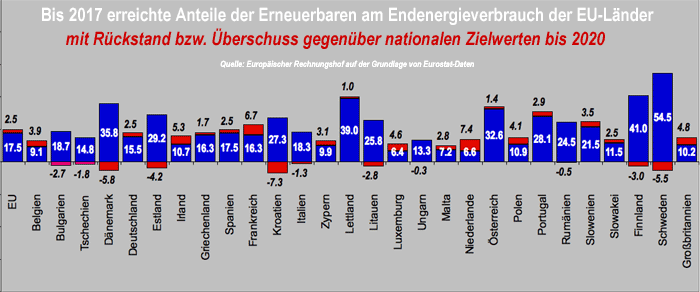 Die Hälfte der EU-Staaten tut sich schwer damit, ihre nationalen Verpflichtungen zur Steigerung des Erneuerbaren-Anteils am Endenergieverbrauch zu erfüllen. Dazu gehört auch Deutschland. Dies ergibt sich aus einem Sonderbericht, den der Europäische Rechnungshof jetzt veröffentlichte (siehe PDF).