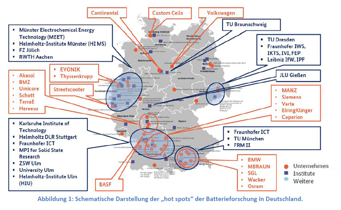 Wie diese Grafik des Bundesforschungsministeriums erkennen läßt, liegen die vier wichtigsten Schwerpunkte der deutschen Batterieforschung in Nordrhein-Westfalen, Baden-Württemberg, Bayern und Sachsen. |