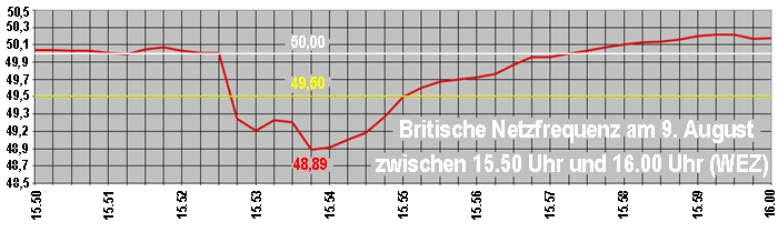 | Die im Abstand von 15 Sekunden durchgeführten Messungen zeigen, dass die Netzfrequenz bis 15.52 Uhr ziemlich genau der Norm von 50 Hertz entsprach. Dann fiel sie schlagartig unter die Toleranzgrenze von 49,50 Hertz. Darin widerspiegelte sich das Erzeugungsdefizit, das durch den Ausfall des ersten Kraftwerks entstand. Die automatisch ausgelösten Regelmechanismen scheinen dann eine kurzfristige Erholung bewirkt zu haben, die aber vom Ausfall des zweiten Kraftwerks durchkreuzt wurde, weshalb die Frequenz noch tiefer bis auf 48,89 Hertz absackte. Spätestens jetzt konnte der völlige Zusammenbruch des britischen Stromnetzes nur noch durch flächendeckende Abschaltungen abgewendet werden. |