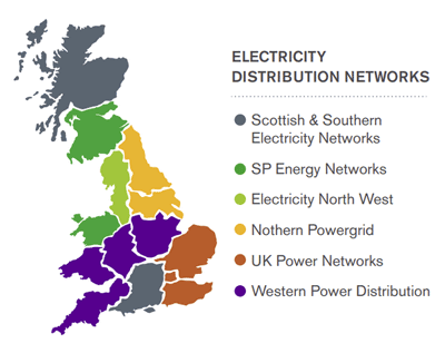Die 14 Strom-Verteilernetze in Großbritannien gehören sechs Unternehmen. Von dem Stromausfall betroffen waren die vier Töchter von National Grid, die in England und Wales zehn Verteilernetze betreiben. Grafik: