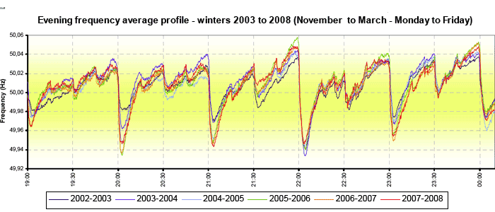Auf dieser UCTE-Grafik sind die "deterministischen Frequenzabweichungen" gut zu erkennen, die der Stromhandel vor allem morgens und abends jeweils zum Stundenwechsel bewirkt. Ebenso ihre Zunahme im untersuchten Zeitabschnitt von 2002 bis 2008. Da es sich um Durchschnittswerte handelt, beträgt die maximale Abweichung von der Norm lediglich etwa 60 Millihertz. Im Einzelfall kann sie aber auch schnell die Abschaltgrenze von 200 Millihertz erreichen und überschreiten (siehe Grafik 2). |