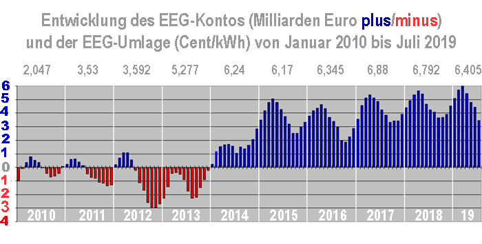 In den ersten vier Jahren nach der Umstellung des EEG-Abrechnungsverfahrens (100407) wies das neu eingeführte EEG-Konto meistens ein Defizit auf – und das trotz einer satten Verdoppelung der EEG-Umlage. Dagegen bewegt es sich seit 2014 nur noch im positiven Bereich und erreichte im März dieses Jahres sogar einen Rekord-Überschuß von sechs Milliarden Euro, obwohl die EEG-Umlage seit 2014 nur noch geringfügig gestiegen ist. Diese Wende wurde offenbar durch eine 2014 in Kraft getretene EEG-Reform bewirkt, die unter anderem die durch Negativpreise bewirkten Verluste bei der Verramschung des EEG-Stroms an der EEX begrenzte und den seit 2009 praktizierten Zwangsverkauf an der Börse (091201) weitgehend durch die sogenannte Direktvermarktung ersetzte (140601). Die 2017 in Kraft getretene Umstellung der Förderung von Wind- und Solarstrom auf Ausschreibungen (160702) hat die zeitweilig starke Schieflage zwischen Förderaufwand und Ertrag weiter verbessert. |