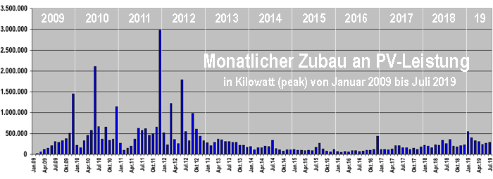 Die Bundesnetzagentur beziffert den bis Juli 2019 erreichten Brutto-Zubau an Solarenergie mit 48.310 Megawatt. Davon entfielen auf die ersten sieben Monate dieses Jahres 2.381 MW. Wenn es bei diesem Tempo bleibt, würde das 2012 installierte Fallbeil im Februar niedersausen und den Festvergütungen für Solaranlagen den Garaus machen.