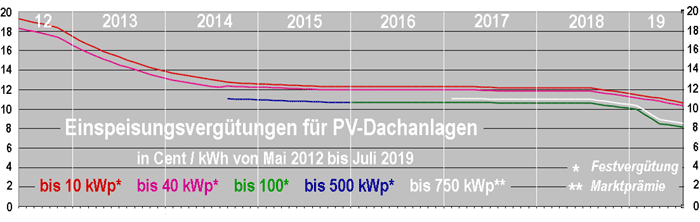 | Als der Bundestag 2012 das Auslaufen der Solarförderung bei einem Zubau von 50 Gigawatt beschloss, waren die Einspeisungsvergütungen pro Kilowattstunde doppelt so hoch wie heute. Die starke Degression der Fördersätze bewirkte zunächst einen steilen Rückgang der Vergütungen. Der Zubau wurde dadurch aber so gering, dass er weit unter den vorgesehenen "Zielkorridor" rutschte, was die vorgesehenen Degressionen größtenteils außer Kraft setzte. Aus diesem Grund hat zwischen 2015 und 2018 die Förderhöhe stagniert oder ist nur geringfügig gesunken. Das änderte sich erst, als der Zubau aufgrund von weiter gesunkenen Anlagenkosten wieder attraktiver wurde. Ab August 2018 griffen deshalb wieder die normale monatliche Degression um 0,5 Prozent sowie die erhöhten Abschläge, die bei Überschreitung eines "annualisierten Zubaues" von 2.500 MW fällig werden. |
