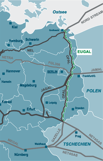 Wieweit das Urteil sonst praktische Folgen hat und ob es nach Inbetriebnahme der zweiten Ostsee-Pipeline tatsächlich den restlichen Gasfluss durch die alten Leitungsverbindungen via Polen und Ukraine erhöht, bleibt abzuwarten. Der Ferngasleitungsnetzbetreiber Gascade, der bis 2012 Wingas Transport hieß und ein Gemeinschaftunternehmen von BASF und Gazprom ist (121101), plant bereits den Bau der Europäischen Gasanbindungsleitung "Eugal". Mit einer jährlichen Transportkapazität von 55 Milliarden Kubikmeter wird die Eugal die über die zweite Trasse ankommenden Gasmengen komplett aufnehmen können. Sie verläuft dabei mit zwei Strängen parallel zur Opal. Der erste Strang endet nach 329 Kilometer bei Weißack (Brandenburg), der zweite nach 480 Kilometer bei Deutschneudorf (Sachsen) kurz vor der tschechischen Grenze. Dort übernimmt der Netzbetreiber Net4Gas bis zu 21 Milliarden Kubikmeter jährlich, um sie dann weiter nach Tschechien, die Slowakei oder auch nach Deutschland zu transportieren. Dabei wird von vornherein akzeptiert, dass die Leitung der üblichen Regulierung unterliegt, wie das von Anfang an auch bei der Nordeuropäischen Erdgasleitung "NEL" der Fall war, die das aus Russland ankommende Gas vom Anlandungspunkt bei Lubmin nach Westen transportiert (131011). Auf die Augenwischerei mit der Verlagerung des Ausspeisepunktes hinter die tschechische Grenze wird deshalb bei der Eugal-Pipeline verzichtet.