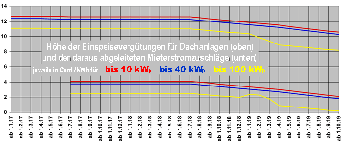 | Die Mieterstromzuschläge errechnen sich aus der Höhe der jeweiligen Einspeisevergütungen pro Kilowattstunde abzüglich 8,5 Cent/kWh. Infolge der seit Mitte 2018 wieder greifenden Degression bei den Einspeisevergütungen läßt das die ohnehin minimalen Zuschläge stark abschmelzen und gegen Null tendieren. In der Leistungsklasse bis 100 Kilowatt (untere gelbe Kurve) wäre der Zuschlag schon im August erloschen, wenn nicht ab Januar 2018 eine Minderung des Abschlag um 0,5 Cent/kWh dafür gesorgt hätte, dass er vorerst noch knapp über Null bleibt. |
