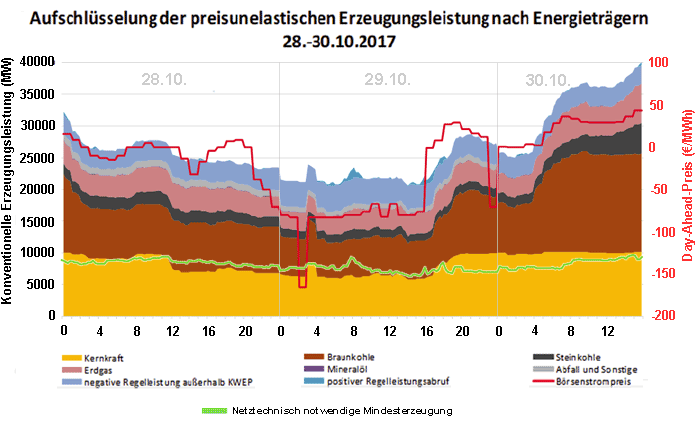Bei negativen Strompreisen wird die mangelnde Elastizität der konventionellen Stromerzeugung besonders deutlich. Diese Grafik veranschaulicht, wie die Betreiber konventioneller Kraftwerke den Strom dann lieber verschenken oder sogar ein hohes Aufgeld für die Abnahme zahlen, anstatt die Produktion auf die netztechnisch erforderliche Mindesterzeugung (grüne Kurve) zu beschränken. Die Abbildung entstammt dem zweiten Bericht der Bundesnetzagentur über die Mindesterzeugung (S. 71) und zeigt einen der elf untersuchten Zeitabschnitte: Ende Oktober 2017 bewegte sich der Strompreis zwanzig Stunden lang ununterbrochen im negativen Bereich und sank bis auf minus 166,06 Euro pro Megawattstunde (die Original-Grafik wurde aus Darstellungsgründen leicht bearbeitet und um die grüne Kurve ergänzt). |